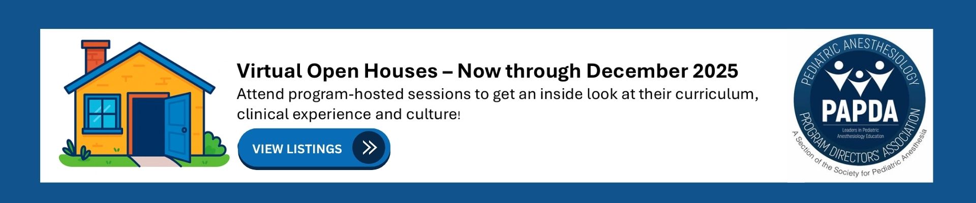 PAPDA is excited to help coordinate virtual open houses for the pediatric anesthesiology fellowship programs! We hope this opportunity to connect with programs will help you learn about the curriculum and people who make each program unique. Please click on the link below for the most current list of programs offering a Virtual Open House. This list will continually be updated so please come back and visit often.